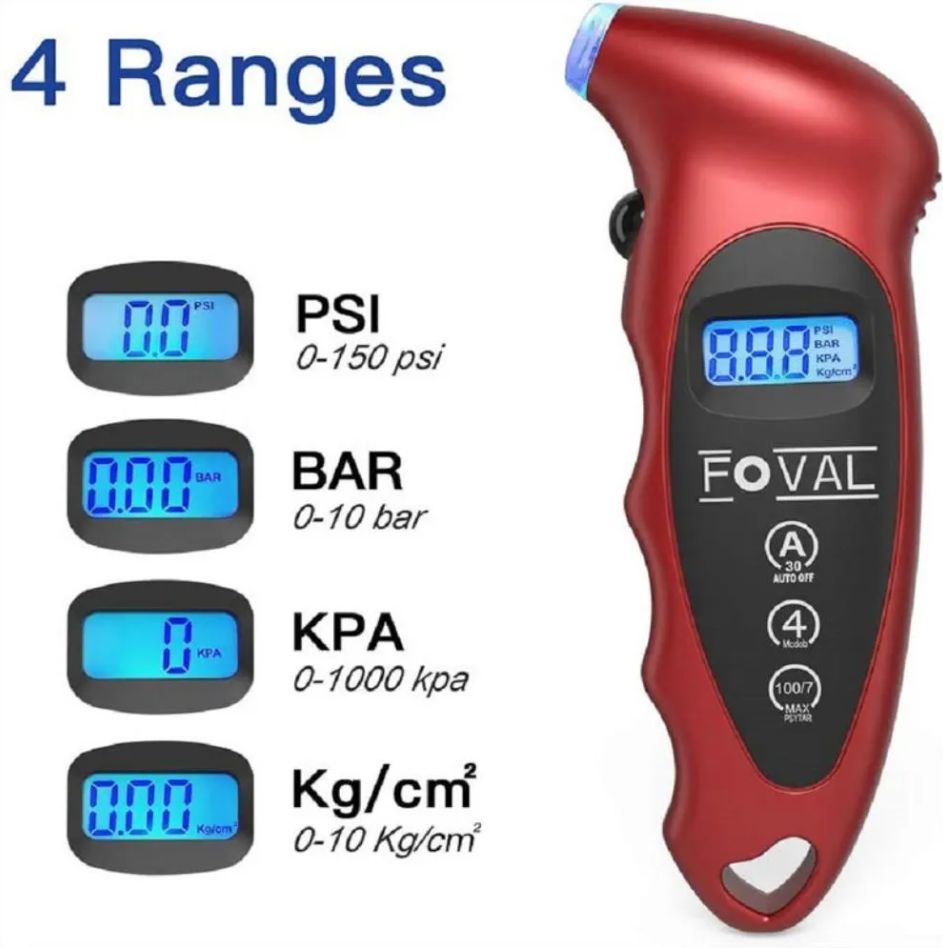 Medidor de Presión de Llantas Digital. Medidor de Presión de Neumáticos Digital. Retroiluminación LCD, monitoreo de aire de neumáticos, 150PSI, probador de mano, herramienta para coche y camión. Características: Pantalla LCD retroiluminada y boquilla iluminada para visibilidad en áreas con poca luz. La pantalla digital Lee de forma instantánea y clara, ya no hace las conjeturas de los medidores analógicos. Sellos de boquilla al vástago de válvula para mediciones rápidas y precisas. Simplemente presione el botón "ON/UNIT/OFF" para encender la herramienta, seleccione el rango y se apaga automáticamente en 30-40 segundos para ahorrar energía. El medidor se restablece automáticamente al tomar presión, sin necesidad de calibrar o restablecer el dispositivo. La textura antideslizante hace que sea fácil de sujetar y el diseño ergonómico es adecuado para las manos de hombres y mujeres. Diseñado para mantener la presión correcta de los neumáticos, reducir el desgaste y prolongar la vida útil de los neumáticos. Especificaciones: Tamaño: 13*4,5*2,5 cm/5,12*1,77*0,98 pulgadas Cuatro rangos de medición: PSI: 0-150, Bar,KPA,Kgf/cm2 Incremento mínimo: 0,5 PSI