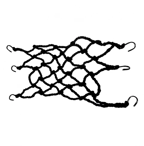 Malla elástica trenzada de excelente calidad, cuenta con ganchos metálicos recubiertos en PVC en los 6 extremos para facilitar su aseguramiento. Ideal para asegurar carga adicional a la motocicleta o bicicleta.