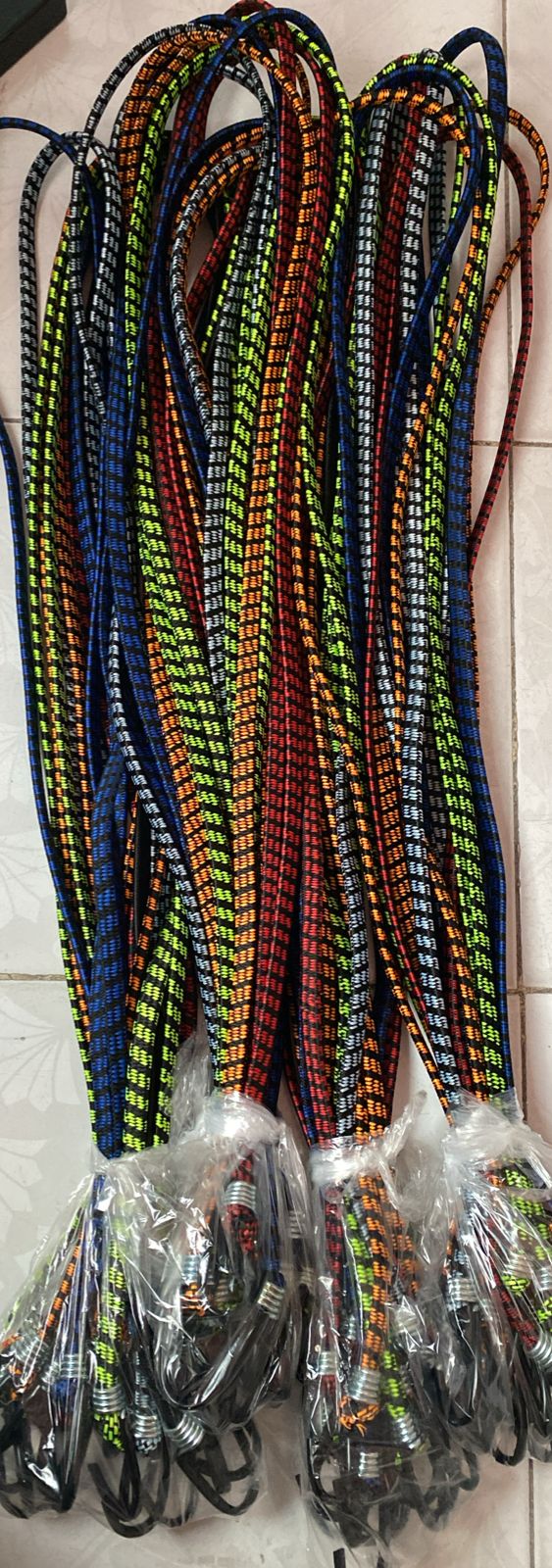 •Pulpo elástico de varias medidas de longitud hasta 1.35 cm elaborado manualmente con látex, hilaza y poliéster. Estiran adicionalmente un poco mas de 3 metros